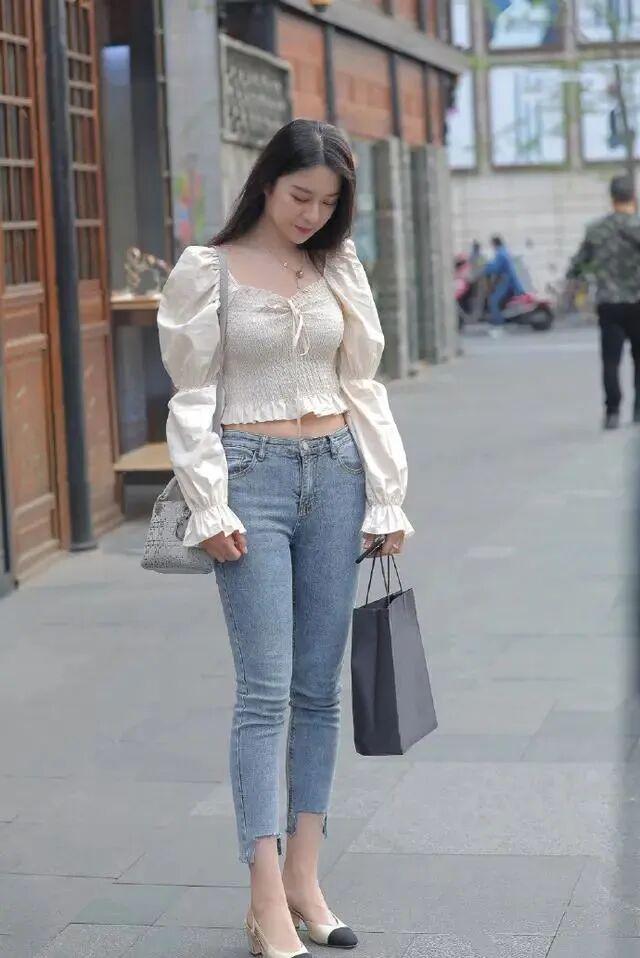 就比如说这位穿着牛仔裤的小姐姐,考虑到夏天气温较高的缘故,这位气质女生特意选择了一条浅色的款式。虽然说在配色上容易给人带来一种略显单调的感觉,但却有着出色的视觉降温效果,从而也就更符合夏日穿搭的格调。当然了,也不排除和小姐姐在穿搭方面的喜好有关。