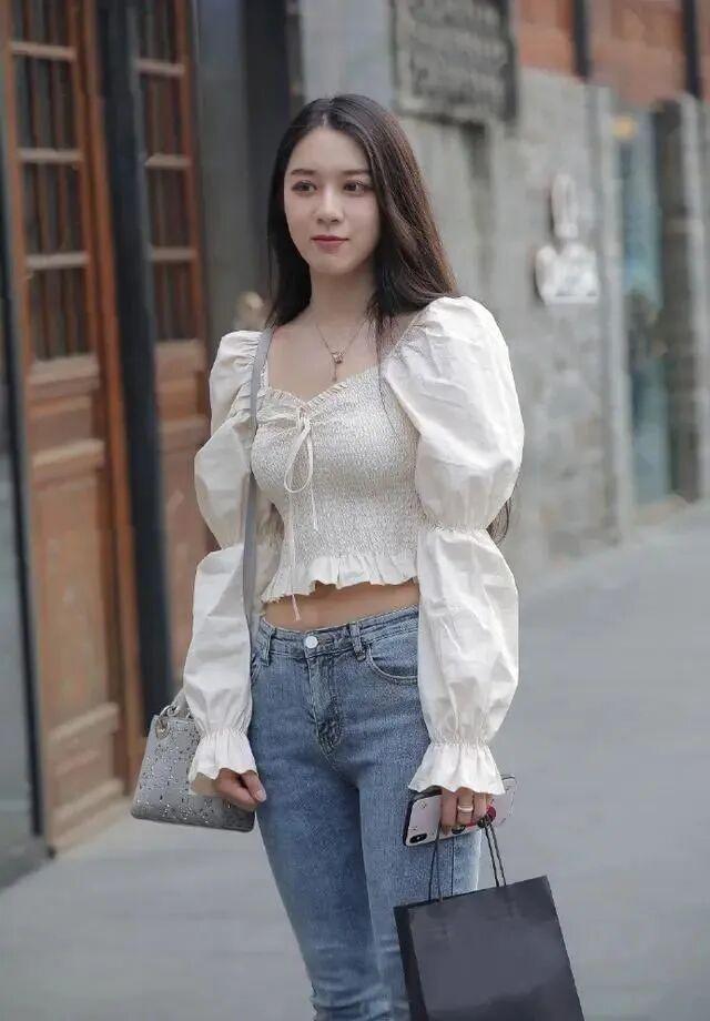 爱穿牛仔裤的女生们都知道,上衣要选择洋气时髦一些的款式,这样才不会辜负牛仔裤的百搭效果。这位小姐姐就是如此,她搭配了一件长袖的短衫。长袖的设计不但防晒,再配合着其立体的轮廓感,更是把手臂线条衬托出纤细的效果。尤其是衣身的部分,采用了大面积的褶皱设计,不但丰富了衣服细节,还提升了整件衣服的层次感。